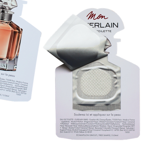 This fully customisable printed sample can be applied to any type of media (card, insert, etc.) and to any size. Another advantage is that LiquaTouch adjusts its label and even the pad it contains to the chosen shape. It is available in double or triple versions to reveal several fragrances in a single marketing operation (press, mailing, distribution at points of sale...).