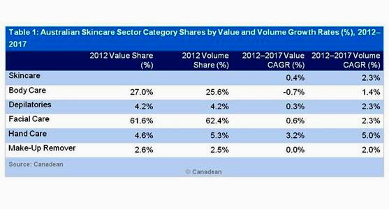 Skincare remains the largest sector in the Australian Health & Beauty Industry. According to research by Canadean, the skincare segment is projected to grow in volume at CAGR (Compound Annual Growth Rate) of 2.3% to 2017. However, due to households low spending, the value growth will be significantly lower over at just 0.4%.