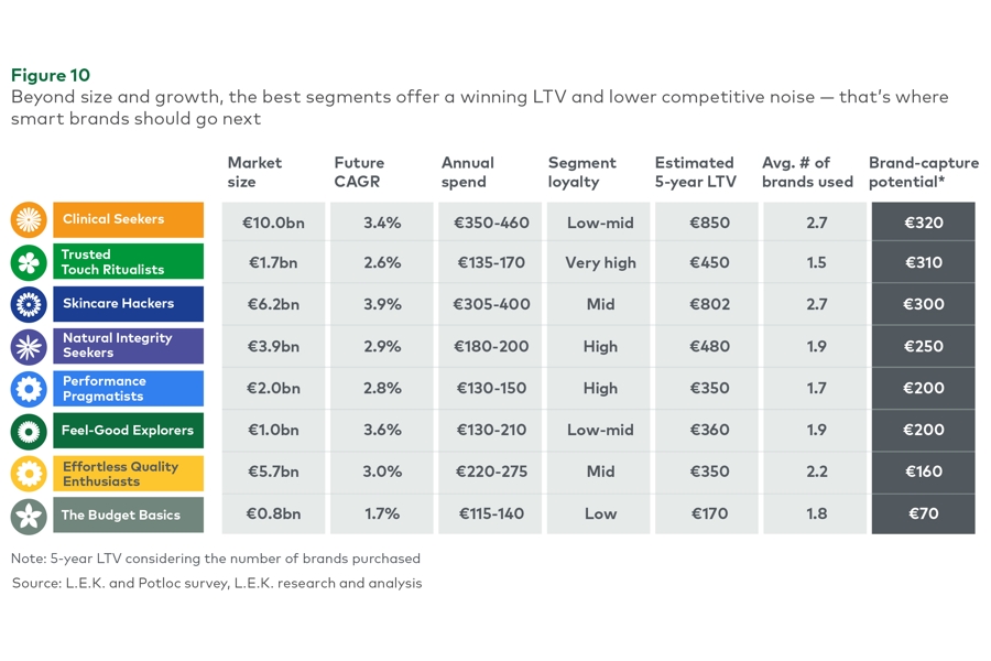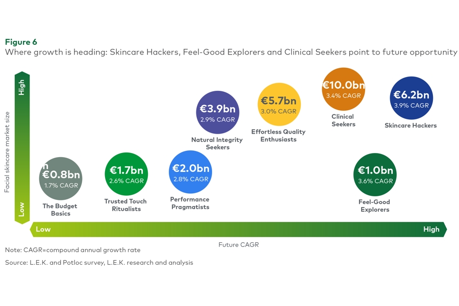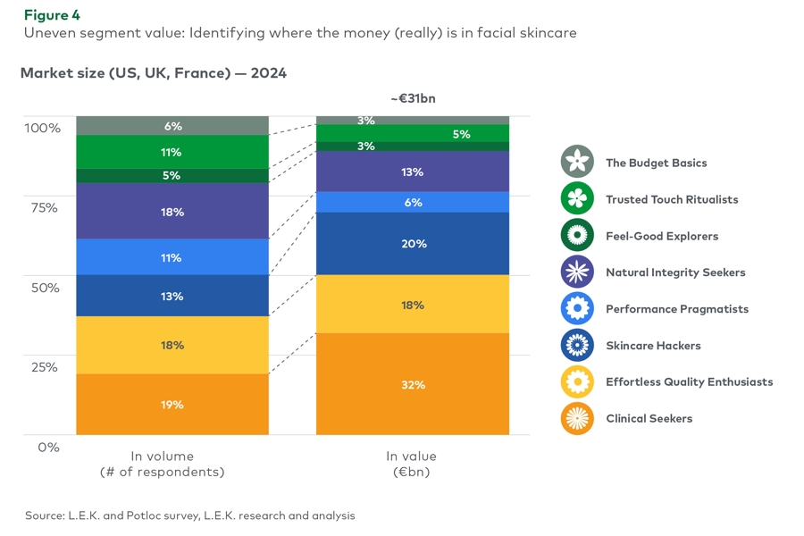 “A sizable segment of the market is focused on effectiveness — and these are big spenders, no question. But there are other consumers, who are drawn to natural products or seek sensorial experiences, pleasure, and luxury. Investing in R&D to boost product performance is always worthwhile, but chasing only clinical profiles can backfire. Trying to tick too many boxes risks diluting your brand’s value proposition,” concludes the L.E.K. Consulting partner.