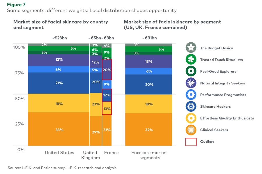 In collaboration with the survey platform Potloc, L.E.K. Consulting interviewed over 3,500 consumers in the United States, the United Kingdom, and France. The sample — representative of facial skincare buyers — enabled the identification of eight behavioral profiles, offering valuable insights into consumer expectations in this market.