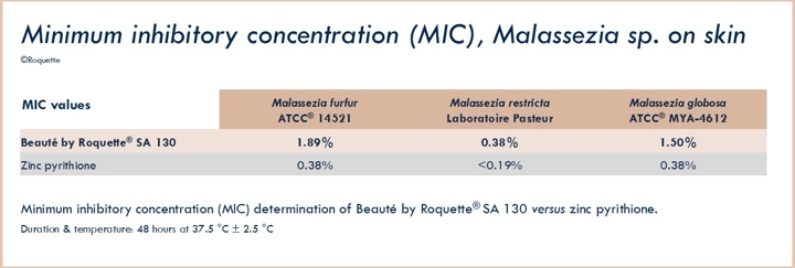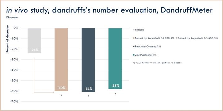 Secondly, a healthy scalp is essential for hair growth, as microbial imbalance and inflammation can hinder follicle activity and contribute to hair loss. Beauté by Roquette® SA 130 has demonstrated antimicrobial activity, inhibiting the growth of Malassezia sp., the fungus associated with dandruff (Picture 3). By reducing the microbial load and preventing excess bacteria and inflammation, Beauté by Roquette® SA 130 helps alleviate dandruff symptoms (clinically proven at 2% - Picture 4) and supports optimal follicle function.