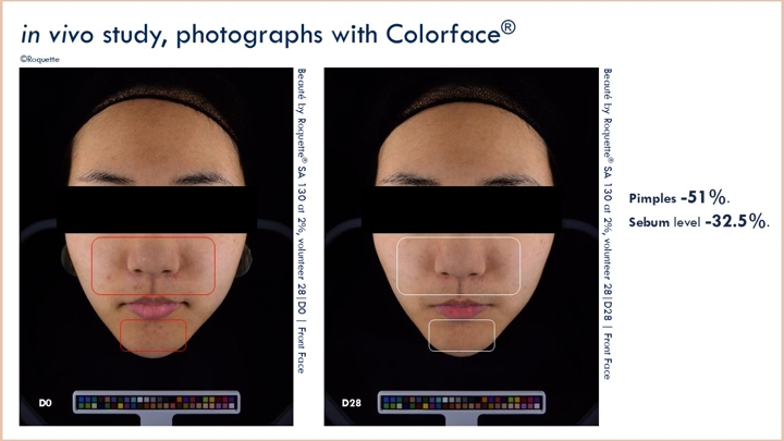 At 2% in a leave-on formula applied twice daily, Beauté by Roquette® SA 130 delivers a significant reduction in sebum levels after 28 days versus salicylic acid. It also reduces imperfections and improves skin appearance (Picture 1).