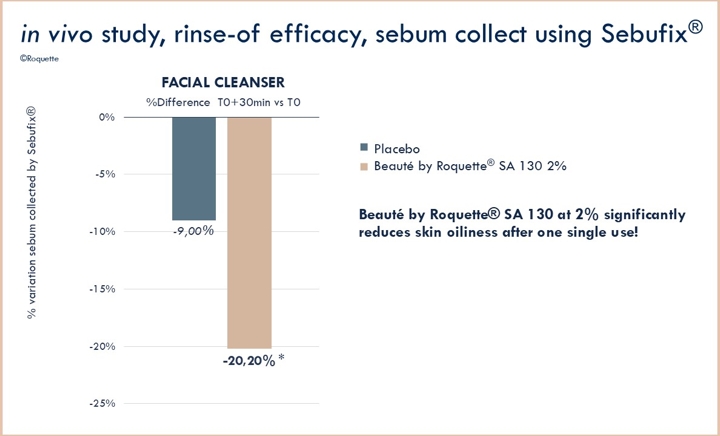 In rinse-off formats, Beauté by Roquette® SA 130 maintains its anti-microbial and sebum-regulating effects. Clinical studies showed significant reductions in imperfections and oiliness (Picture 2). Tested at 2% in a facial cleanser, it improved overall skin condition in only 14 days and is efficient after one single use.