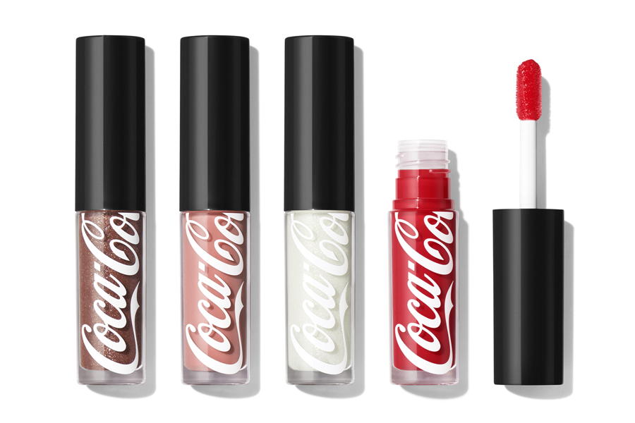 The collection is completed by a set of four liquid lipsticks (Coke-can red, glitter packed caramel, all-gold shimmer and nude pink) and a set of seven brushes designed to reference the iconic soda bottle, which are presented in a special carry-case.