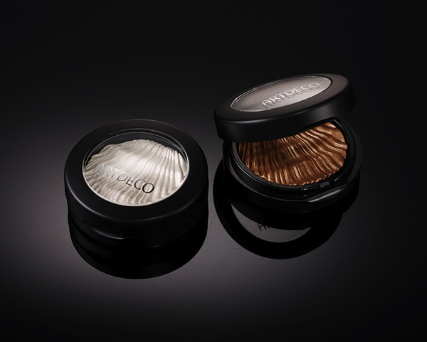 Corpack’s round, matte-black eye shadow compact contrasts with the shimmering, powder content of Artdeco’s glam deluxe collection.