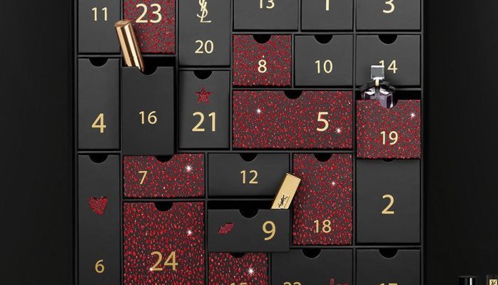 In order to magnify the magic of the Advent calendar with its fragrance, skincare and makeup miniatures , Cosfibel made a coffret based on a thick card body. It is coated in screen printed glitter paper, its inside adorned in minimal matte black. The two magnetized doors join together with the famous YSL logo, made from cut-out card coated with polyester paper and applied by hand.