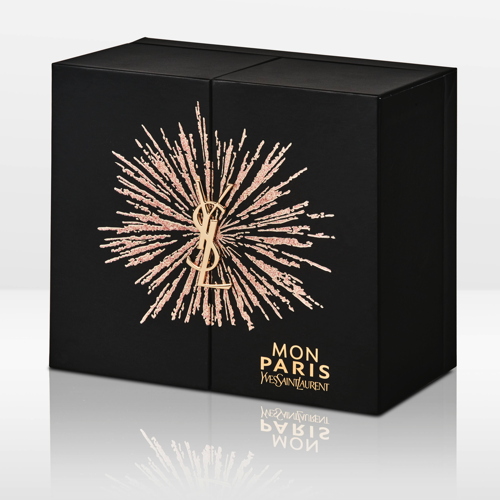 This front-opening gift box is built on a cardboard base entirely coated with silver polyester paper printed in an intense black shade. On its façade, an explosion-like décor emblematic of the Yves Saint Laurent holiday campaign is achieved with several successive layers of color: the motifs are printed in gold before screen printing in three shades of glitter. The logo and the name of the fragrance are printed in a gold hue. A zamac plaque is glued at mid-height onto the façade, in the centre of the décor.