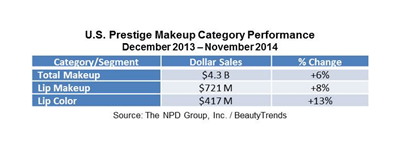 With total lip makeup sales being up for the 12 months ending November 2014, growth in lip makeup is not limited to lip colour or a single month. Lip products are among the primary drivers of total prestige makeup growth, which is the overall prestige beauty leader.