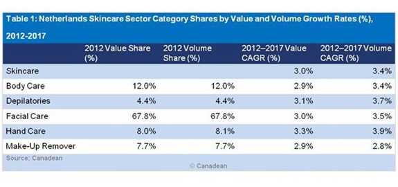 The skincare sector in The Netherlands is showing positive growth, in the shadow of continued economic weakness. According to market research firm Canadean a value Compound Annual Growth Rate (CAGR) of 3.0%, places skincare in third place out of the top five health and beauty sectors in the Netherlands for 2012 to 2017. Furthermore, Canadean forecasts volume will grow at a slightly higher CAGR of 3.4%.