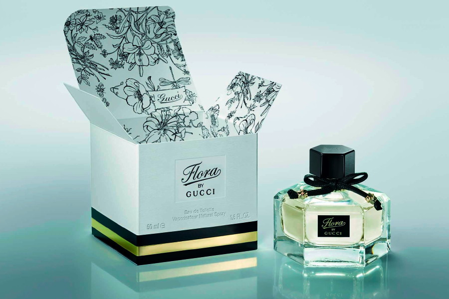 Flora by Gucci aims to capture the cheerful playfulness of the design in a feminine fragrance, presented in a hexagonal glass bottle, which allows the light pink liquid to gently shimmer through. As a further highlight, a black bow is tied around the black cap of the bottle, which is also hexagonal.