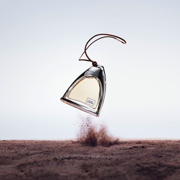 The fragrance comes in a stirrup-shaped bottle finished with a leather lace.