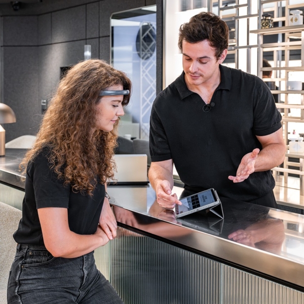 In practice, customers in-store are invited to wear a sensor-equipped headband that records brain activity in real time throughout the discovery session. The emotional response elicited by each fragrance—captured through the brain’s alpha, beta, delta, theta, and gamma waves—is then processed by an algorithm, which translates it into an emotional compatibility indicator known as the FocusCalm Score.