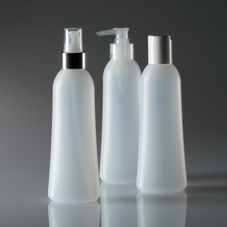 The 200ml Eternal bottle is manufactured in high-density polyethylene (HDPE) and has a gently flared shape with softly rounded shoulders. The 24/410 neck takes a large selection of standard closures which can totally change the appearance of the product.