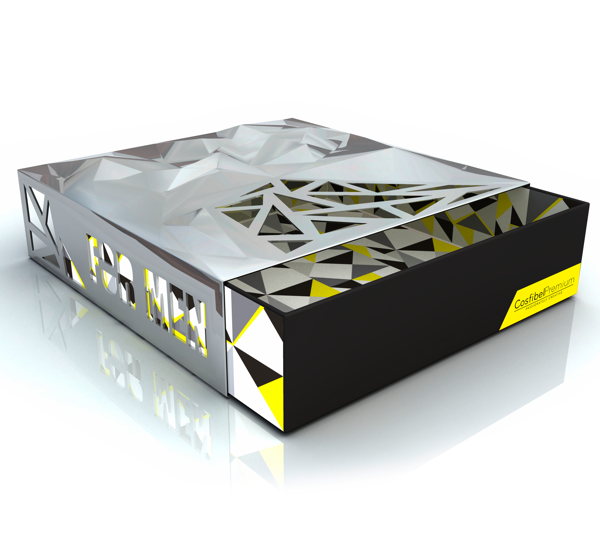 Developed by Cosfibel for the men’s grooming sector, this gift box is comprised of a mounted board base and an engraved and cut-out metal sheath that gives an industrial touch.