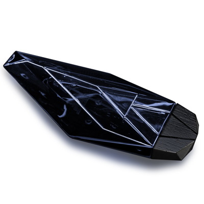 The caps produced by Pujolasos Wood & Pack are made with black stained ash wood, matching with the modernist art-deco bottle made out of lacquered crystal. The ensemble (bottle and cap) is delicately carved in the shape of precious crystals.