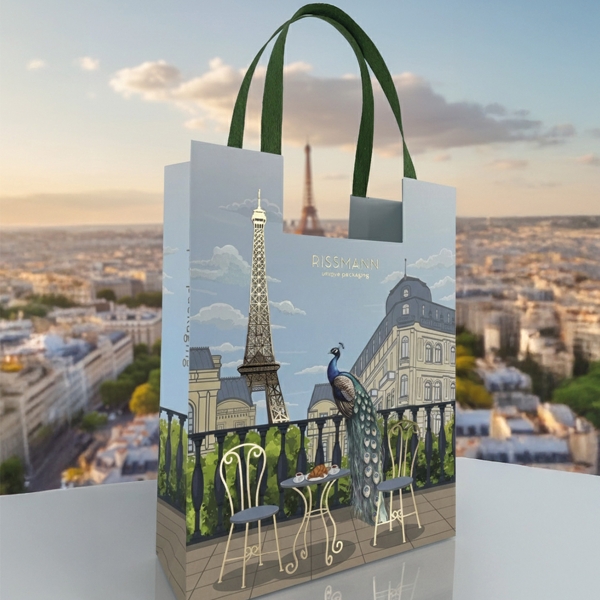 After a preview at Luxe Pack Monaco, Rissmann also unveiled in Paris a new version of its iconic shopping bag. It retains the signature finishes of the Skyline Edition - four-colour offset printing, combinations of matt, metallic and pearlescent effects, as well as embossing and debossing effects - and is enriched with innovative and outstanding finishing processes: gold hot foil stamping with a 3D optilevel effect that looks embossed while remaining perfectly flat, shiny and matt contrasts created by nano-embossing using only one single tool.