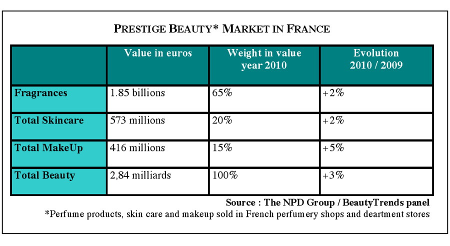 After a stagnating market in 2008 and declining sales (-1%) in 2009, the selective / prestige channel grew by almost 3% in 2010 (+2.6% in value and +1.6 in volume), according to NPD. Finally, French perfume shops would have sold perfume 2.84 billion euros of perfume, skincare and other makeup products.