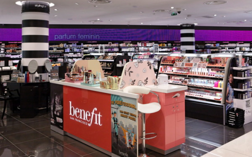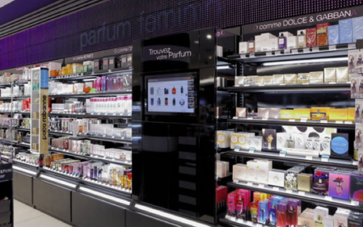 There are several innovations in this resolutely electronic shop: a touch screen to help customers find their fragrance, different colours of LED to structure the different areas (red for the nails area, pink for the women’s perfumes area, gold for the men’s fragrances area).