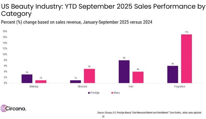 From January through September 2025, prestige market sales increased by +4% to USD 24.1 billion and units sold were also up +4%, over the same period last year. Sales in the mass market increased +5% to USD 54.5 billion and units sold grew +2%.