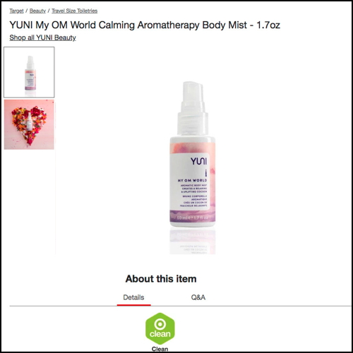 Target has introduced a ’Clean Beauty’ icon, as seen displayed alongside this Yuni ’My OM World Calming Aromatherapy Body Mist’ (Photo: ©Courtesy of Yuni)