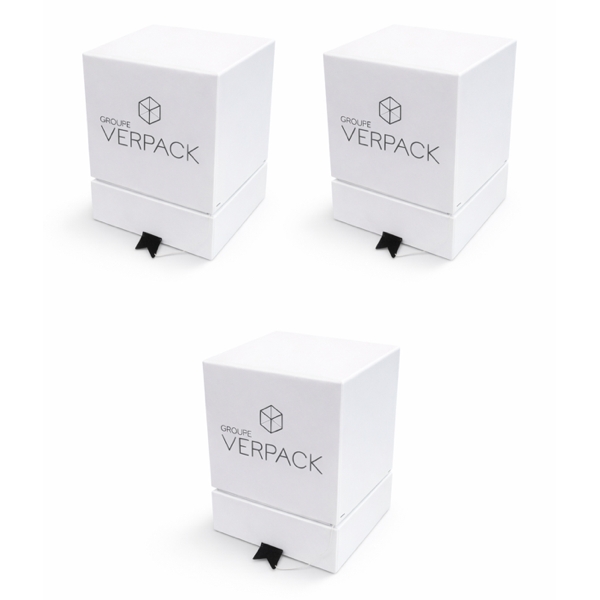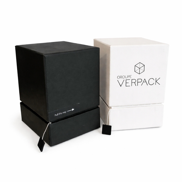 Developed by Verpack’s R&D team, the system works on a coffret with a base and lid joined by a precisely sized groove. Once filled and sealed with double-sided tape, the coffret can be opened in a single gesture: pulling the string severs a hidden paper strip inside the groove, releasing the lid.