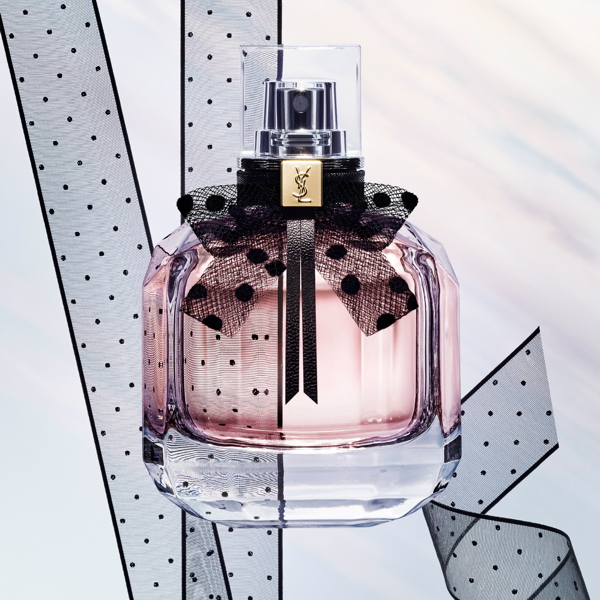 Like the original fragrance, "Mon Paris Eau de Toilette" comes in a round, multifaceted bottle with a black tie around the neck. Finished in a feather-inspired black mesh netting, the bow is lighter and more feminine in appearance than the original.