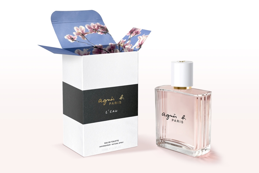 Le motif du cœur, presque une signature pour la créatrice, est présent. Composé de façon baroque avec des rameaux de fleurs, il orne exclusivement le verre des flacons vendus en boutique. Le packaging reprend les rayures noires et blanches propres à son vestiaire. À l’intérieur des étuis sont imprimées des photographies de magnolias et de seringas prises par Agnès b. « On a l’impression de rentrer dans son jardin », décrit Alnoor. Ces mêmes visuels se déploient sur les présentoirs (vitrines, podiums…).