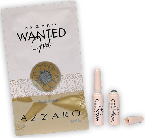 Après le lancement du parfum masculin Azzaro Wanted en 2016, voici Azzaro Wanted Girl. Pour accompagner ce lancement, le groupe Clarins a choisi un échantillon original, audacieux et au fait de la tendance : une ampoule roll-on (Seriplast) pour une gestuelle inattendue.