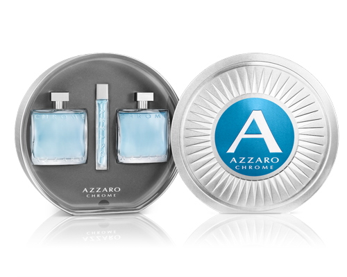 Le coffret de 26 cm de diamètre présente dans sa forme arrondie une face plane lui permettant de se présenter sur la tranche. Azzaro l’a décliné pour quatre de ses références : Azzaro pour homme, Azzaro pour elle, Chrome et Wanted.
