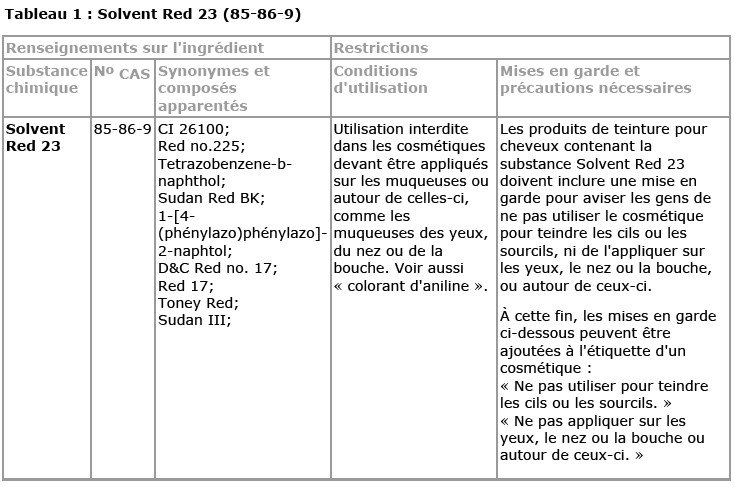 – Solvent Red 23 (CI 26100 / n° CAS : 85-86-9), dont il proposé d’interdire l’utilisation dans les cosmétiques devant être appliqués sur les muqueuses ou autour de celles-ci,