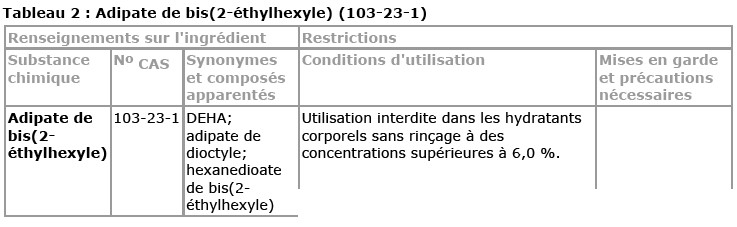 – Adipate de bis (2-éthylhexyle) ou DEHA (n° CAS : 103-23-1), dont il est proposé de limiter la concentration à 6 % dans les hydratants corporels sans rinçage.