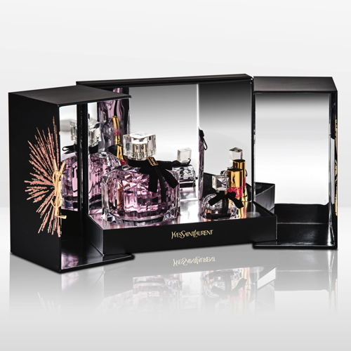 Ce coffret à portes est bâti sur la base d’une carcasse en carton entièrement recouverte d’un papier polyester argent imprimé noir intense. Sur la façade, le décor en explosion emblématique de la campagne Noël Yves Saint Laurent est réalisé en plusieurs teintes successives : une impression or des motifs suivie d’une sérigraphie de trois coloris de paillettes. Le logo et le nom du parfum sont imprimés en teinte or. Une plaque en zamac est collée à mi-hauteur de la façade au centre du décor.