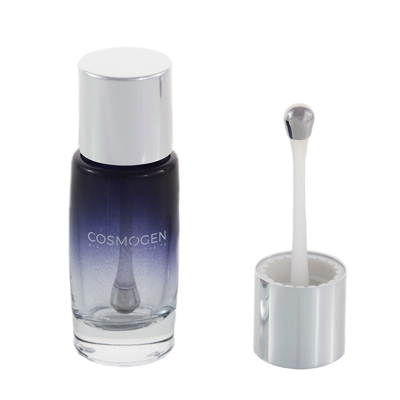 Le verre fait son retour chez Cosmogen, en symbiose avec le métal au sein d’un duo pack et applicateur particulièrement approprié aux sérums. Son embout en zamak frais permet une application en douceur, par lissage ou par point de pression sur la zone à traiter telle que yeux et lèvres.