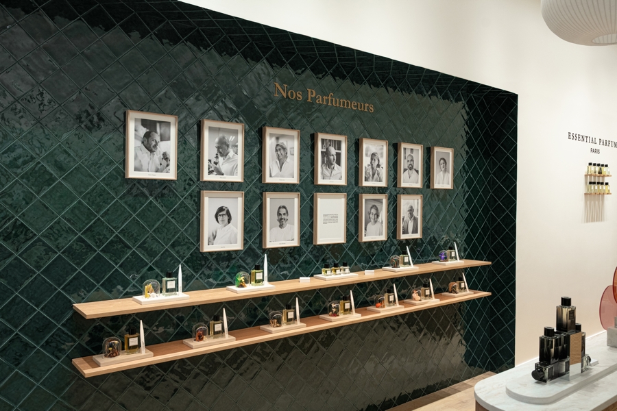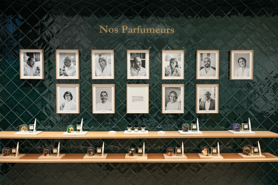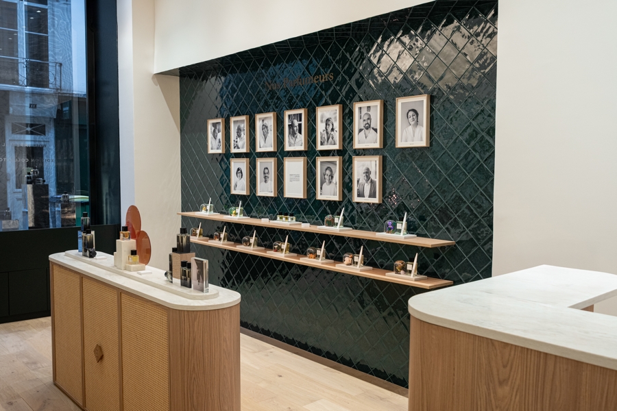 Au cœur de l’espace, le mur des parfumeurs, en céramique vernissée verte, rend hommage à celles et ceux qui signent les créations de la maison. Les portraits en noir et blanc de ces artistes dialoguent avec la texture profonde du carrelage, symbole de naturalité, de matière et d’émotion. Face à lui, une bibliothèque en bois clair et laiton expose les flacons comme autant des objets d’art. Enfin, un salon intimiste se niche à l’arrière de la boutique, pour des expériences à la fois personnalisées et conviviales.