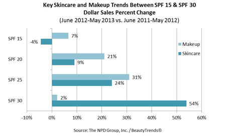 Selon The NPD Group, l’essentiel de la croissance actuelle des produits avec un FPS provient des produits de soin dont les ventes en dollars ont constamment connu une croissance à deux chiffres au cours des trois dernières années. Dans l’ensemble, les ventes (en valeur) de maquillage avec un FPS ont surtout progressé sur les 12 mois se terminant en mai 2012 (Juin 2011 - mai 2012).