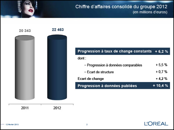 Jean-Paul Agon, Président-Directeur Général de L’Oréal, avait raison de se montrer optimiste lors de la présentation des résultats du groupe au 1er semestre 2012. Alors que le marché mondial des cosmétiques a progressé de 4,6% en 2012, la croissance du chiffre d’affaires de L’Oréal a été de 10,4 % pour atteindre 22,463 milliards d’euros au 31 décembre 2012. À données comparables, c’est-à-dire à structure et taux de change identiques, la croissance du chiffre d’affaires du Groupe L’Oréal ressort à + 5,5 %. Le groupe a bénéficié d’un effet de change plutôt favorable du fait de la (relative) faiblesse de l’euro au début de l’année 2012. A total, les effets monétaires ont eu un impact positif de + 4,2 %. Quant au résultat net du groupe, il a progressé de 17,6 %.