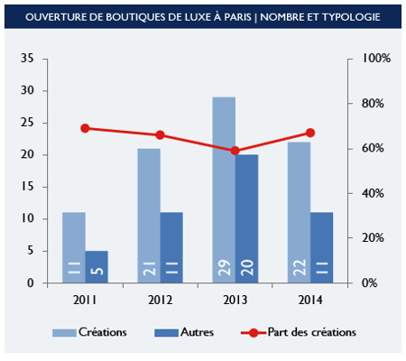 En ce qui concerne le segment spécifique du luxe, l’évolution du contexte économique a, selon Cushman & Wakefield, limité le nombre de nouveaux entrants en 2014 et incité les enseignes de luxe à rationaliser leur réseau de boutiques. Une part importante des projets recensés en 2014 dans le cœur historique du luxe parisien ont ainsi porté sur des opérations de transfert, de rénovation ou de repositionnement.