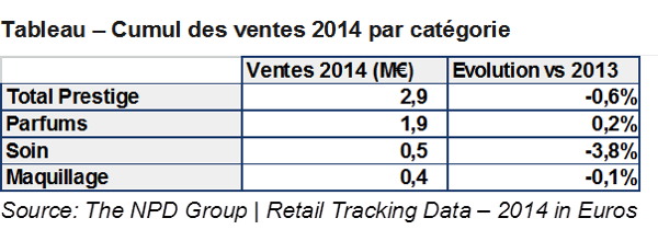 « Cette fois encore, le marché français de la beauté montre qu’il résiste dans un contexte économique difficile, » souligne The NPD Group. Selon la société d’études de marché, les ventes de cosmétiques sélectifs affichent un recul de -0,6% en 2014 (contre -0,9% en 2013), soit un chiffre d’affaire total de près de 2,9 milliards d’euros.