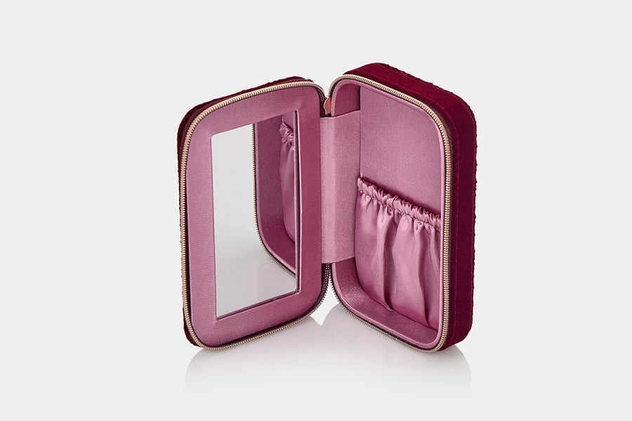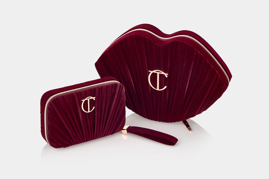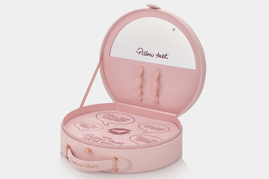 Le coffret Pillow Talk est complété d’une trousse à mini-pinceaux en velours cramoisi, ornée de plis sur les deux faces et d’une dragonne en velours. Un miroir est intégré au couvercle. Une trousse pour rouges à lèvres en velours, en forme de lèvres, a également été créée. Les deux trousses sont doublées de polyester satiné et munies d’une fermeture éclair dorée rose en nylon.