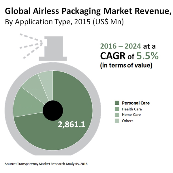 Selon l’étude publiée par Transparency Market Research (TMR) [1], le marché mondial des emballages airless devrait progresser de 5,5% par an [2] de 2016 à 2024 en valeur. La valeur globale du marché est estimée à 4,13 milliards de dollars fin 2016. Elle devrait atteindre 6,34 milliards de dollars à la fin de 2024.
