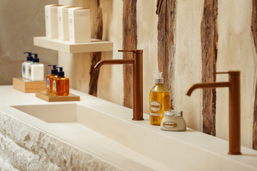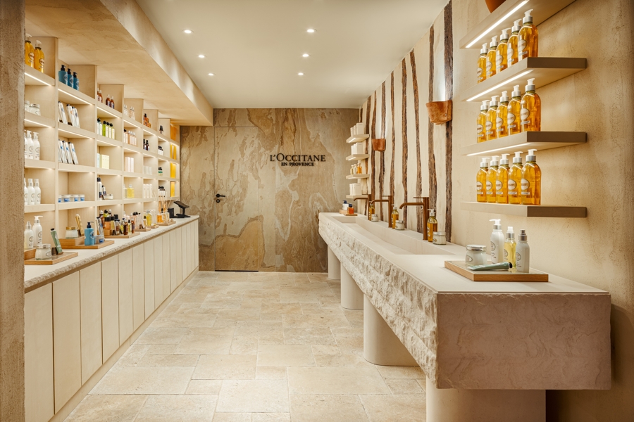 L’espace a été conçu comme un hommage aux matières naturelles et à la sobriété chaleureuse de la Haute-Provence, berceau de la marque L’Occitane. On y retrouve ainsi des murs enduits de chaux, des peintures aux tons beiges solaires et reposants, un carrelage minéral et une spectaculaire vasque en pierre brute de plus de deux mètres de long.