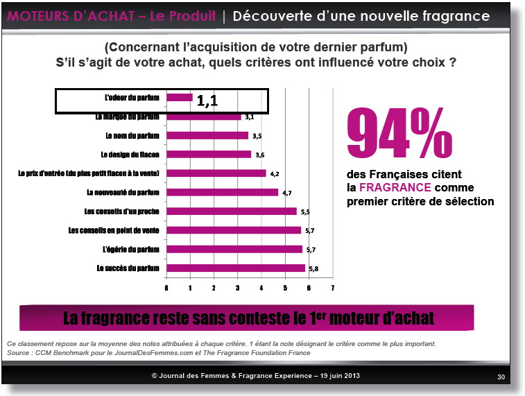 L’olfactif est cité comme le premier critère de choix d’un parfum par 94% des femmes, devant la marque et le nom du parfum. L’égérie apparaît loin dans le bas du classement. Des déclarations qui ont laissé sceptiques une partie des professionnels réunis pour la présentation des résultats, plusieurs d’entre eux estimant que cela ne correspondait pas à l’expérience du marché. Mais pour d’autres, au contraire, le succès de La Petite Robe Noire de Guerlain, montre bien que le style et le regard sur le monde comptent davantage.