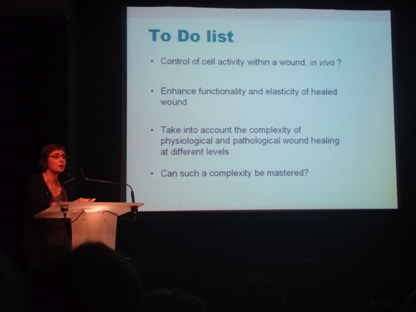 Parmi ces derniers, l’Institut de Biologie et Chimie des Protéines travaille sur des non tissés selon un nouveau procédé de jet spraying qui a l’avantage de donner des fibres plus souples. « Nos 1ers tests montrent une réduction de l’activité des myofibroblastes dans le processus de cicatrisation, » explique le Docteur Dominique Sigaudo Roussel, venue présenter ses recherches sur un tissu biomimétique pour améliorer la cicatrisation.