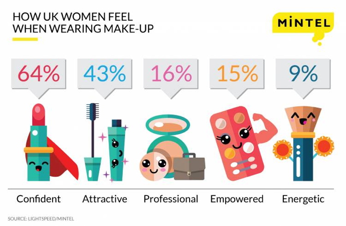 Si l’on s’intéresse aux raisons pour lesquelles les femmes se tournent vers leur trousse de maquillage, 41% des britanniques interrogées disent qu’elles veulent paraître moins fatiguées, 39% veulent couvrir des taches et 25% veulent avoir l’air plus belles. L’étude de Mintel souligne également le lien émotionnel important entre les britanniques et leurs produits de maquillage. Plus de 3 femmes sur 5 (64%) estiment que le maquillage leur permet de se sentir plus en confiance et 43% de se sentir plus séduisantes, alors que 16% seulement se sentent plus professionnelles.