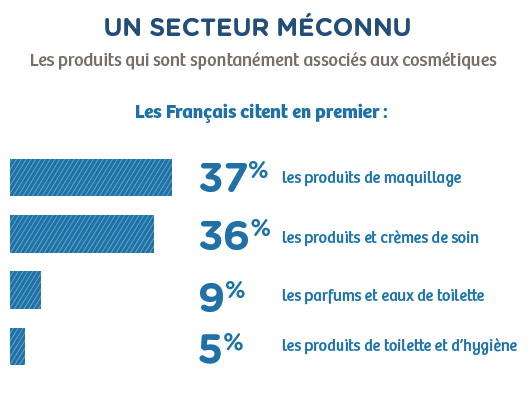 Toutefois, l’étude a révélé qu’une majeure partie des consommateurs a une vision partielle de ce que sont les produits cosmétiques. En effet, lorsque l’on demande aux personnes interrogées de citer spontanément les produits appartenant au secteur des cosmétiques, 37% d’entre elles mentionnent en premier lieu les produits de maquillage et 36% les produits et crèmes de soin. A contrario, seuls 9% des citent les parfums et eaux de toilette, et 5% les produits de toilette et d’hygiène !