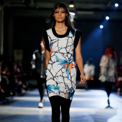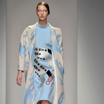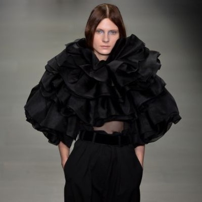 Les imprimés délurés sont de mise cette saison. Les collages artistiques et d’étranges motifs représentant des mains manucurées se sont multipliés. Chez Holly Fulton, Andrew Gallimore a choisi un eyeliner métallique pour créer un double-trait en accord avec ces dessins farfelus.