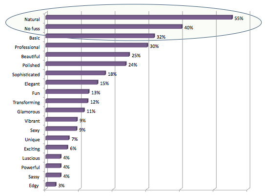 L’impression commune qui a émergé de l’enquête est que les utilisatrices de maquillage veulent un aspect naturel et authentique, plutôt que quelque chose d’« ultra-moderne » ou de « sophistiqué ». Plus de 40 pour cent d’entre elles choisissent les mots « naturel » et « sans souci » pour décrire leurs lignes de maquillage préférées. À l’inverse, les mots comme « à la pointe » et « impertinent » occupent le bas de la liste.