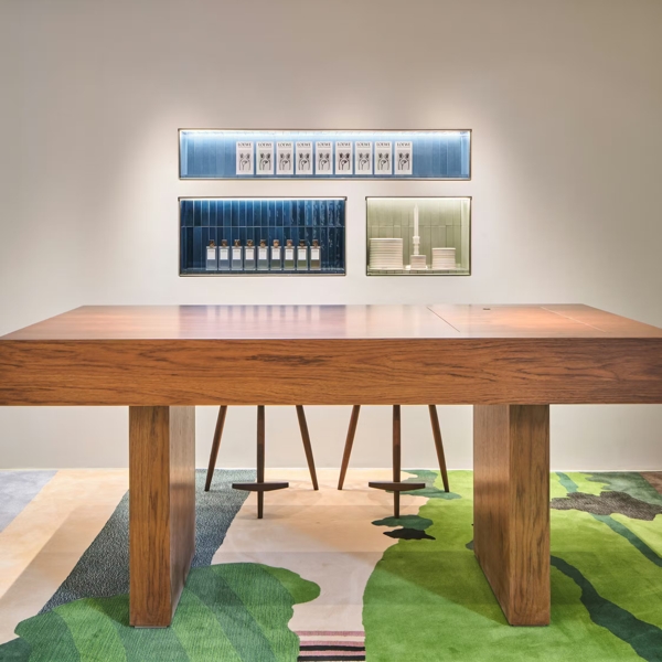 Déployé sur deux niveaux, l’espace présente l’ensemble des parfums de la Maison du groupe LVMH, dont les collections Crafted Collection, Botanical Rainbow et Un Paseo por Madrid, ainsi que les lignes Home Scents et Bath. La décoration combine l’univers botanique de Loewe à une sensibilité espagnole et à des références du design coréen.