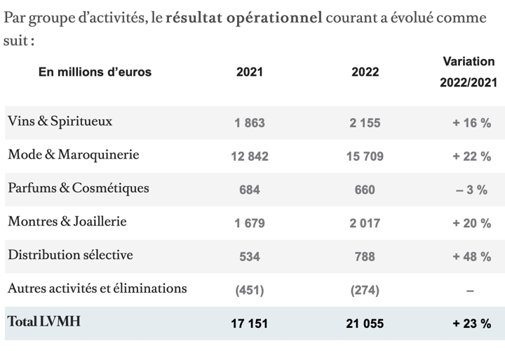 Toutes les activités réalisent une croissance organique significative de leurs ventes sur l’année. La Mode et Maroquinerie en particulier, qui atteint des niveaux records, réalise une croissance organique de 20 %. Le résultat opérationnel courant 2022 s’établit à 21,1 milliards d’euros, en hausse de 23%. La marge opérationnelle courante se maintient au niveau de 2021. Le résultat net part du Groupe s’élève à 14,1 milliards d’euros, en croissance de 17% par rapport à 2021. Le cash-flow d’exploitation disponible dépasse les 10 milliards d’euros.