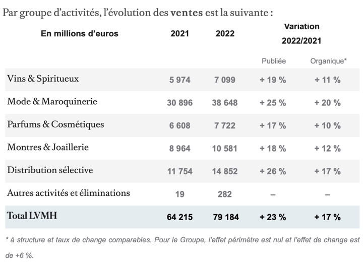 Le géant du luxe a réalisé en 2022 un chiffre d’affaires de 79,2 milliards d’euros, et un résultat opérationnel courant de 21,1 milliards d’euros, tous deux en croissance de 23%. La part de résultat net du groupe s’élève à 14,08 milliards d’euros (en hausse de 17%).